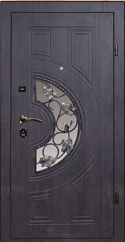 Часто декорирование дверей ковкой используют вместе со стеклом, отделывают витражным узором, используют зеркальные вставки. Стекло в этом случае применяется антивандальное, с трудом поддающееся разрушению.